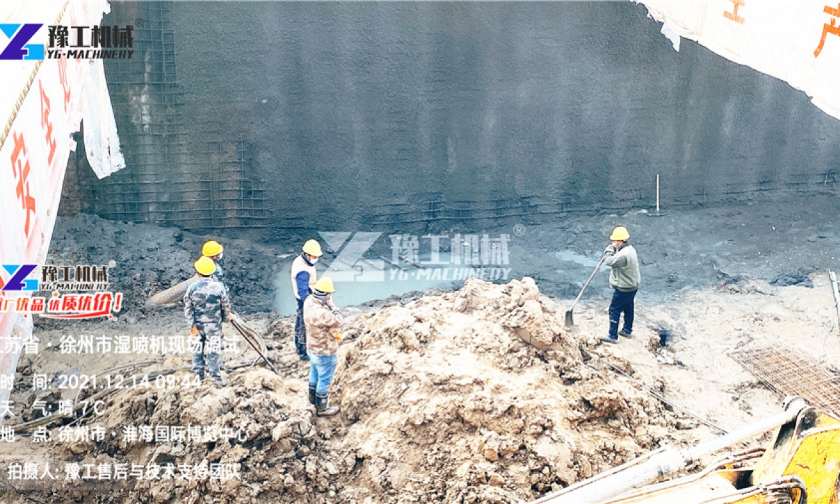 徐州奧體中心地鐵站項目,由中鐵十八局承建,此次訂購的液壓濕噴機主要用于地鐵基坑支護施工??蛻糁坝嗁彽霓D子式噴漿機,因為工人反饋一直有堵管現(xiàn)象,影響工期,不得已重新訂購!為保證客戶工期不誤,工廠安排物流發(fā)專車連夜為客戶送貨。在與發(fā)貨部確認設備到達的時間后,豫工售后與技術支持部工程師喬工乘高鐵從鄭州出發(fā),在設備送抵工地的第一時間趕到客戶工地——徐州中鐵十八局奧體中心地鐵站施工現(xiàn)場。作為對風量、混凝土漿料要求很高的設備,試機過程中,液壓濕噴機采用骨料粒徑15mm,混凝土塌落度150-180的混凝土漿料,配合16/10型空壓機,設備水平輸送距離輕松達到80米,垂直噴射距離達到50米,生產(chǎn)能力每小時7立方。