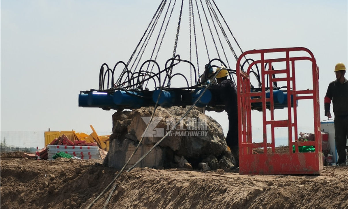 客戶所在項(xiàng)目位于山西運(yùn)城,中鐵大橋局 黃河大橋建造工程,樁徑2.3米,樁高3-4米,共700多根樁??蛻粲嗁?gòu)破樁機(jī)特別謹(jǐn)慎,在咨詢多個(gè)破樁機(jī)廠家后,終鎖定豫工機(jī)械??蛻暨x擇的是17個(gè)破樁模塊,30KW液壓泵站全套設(shè)備。 施工旺季,剛剛結(jié)束廣西百色中交四公局巴馬-憑祥公路2-2.2米樁徑安裝調(diào)試的蘇工,來不及休息,即馬不停蹄趕赴客戶施工現(xiàn)場(chǎng)。 憑借多年服務(wù)經(jīng)驗(yàn),在工人配合下,蘇工很快完成破樁機(jī)的安裝調(diào)試! 試機(jī)過程中,17個(gè)模塊,6噸重破樁機(jī),在30KW泵站配合下,由55噸位吊車吊起,在蘇工的指揮下緩緩套入樁身,每30公分截取一次,單次截樁時(shí)間2-3分鐘,3米高樁柱,30分鐘破除。