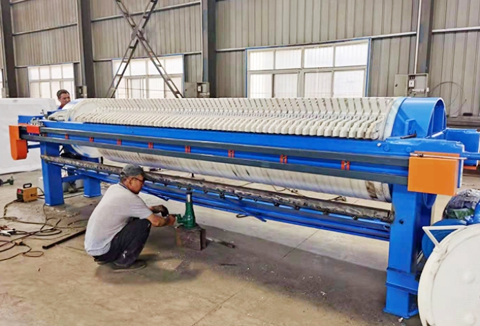 機械壓緊壓濾機是由電動機帶動減速機,經(jīng)齒輪帶動絲杠推動壓緊板壓緊濾板。大齒輪采用滾珠運動能保證壓緊時的可靠性和穩(wěn)定性。用繼電器控制電流實現(xiàn)壓緊后自動停止,可對電機實現(xiàn)過熱和過載保護。具有性能穩(wěn)定、結構簡單、操作方便、安全、省力,易維修,經(jīng)久耐用。